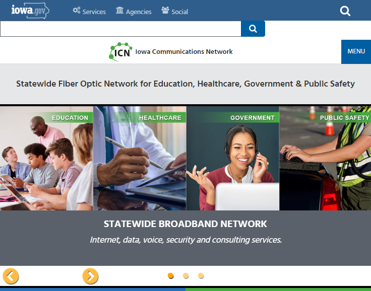 The Iowa Communications Network is an independent state agency that administers Iowa's statewide fiber optic telecommunications network. They are a state agency, is a state-of-the-art fiber optic network providing telecommunications and data services including high-speed broadband Internet, data, voice (phone), security, and consulting services.