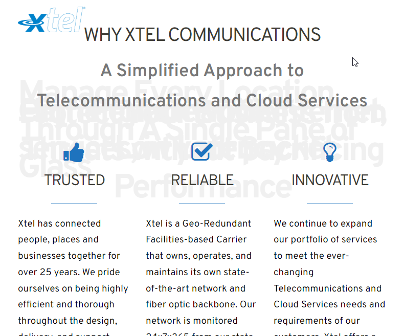 Xtel is a Cloud Services provider that delivers four core service offerings: Unified Communications, Network Security, Network Connectivity and Voice Services.